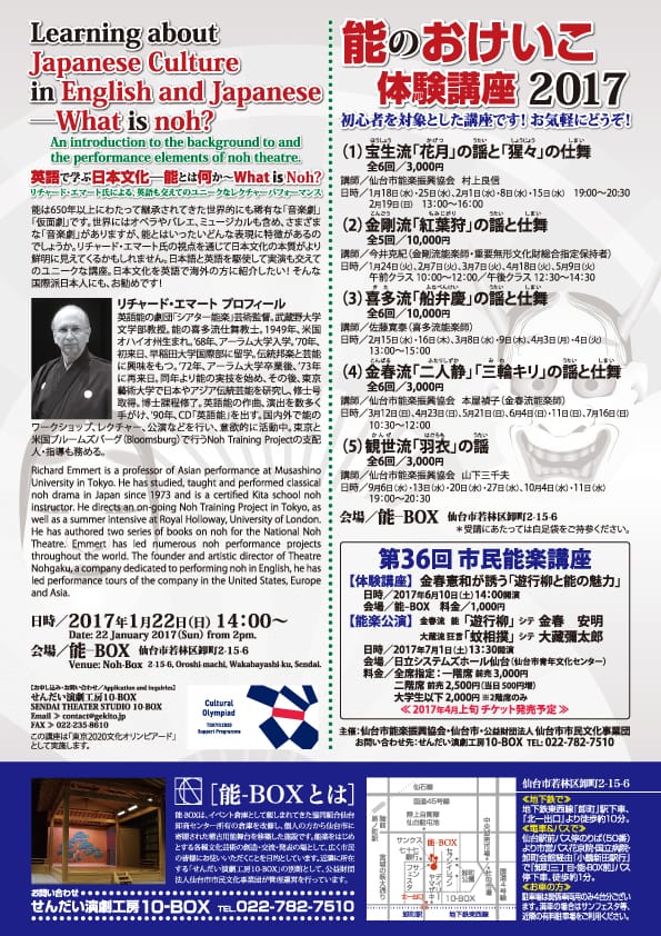 能は650年以上にわたって継承されてきた世界的にも稀有な「音楽劇」であり「仮面劇」です。世界にはオペラやバレエ、ミュージカルも含め、さまざまな「音楽劇」がありますが、能とはいったいどんな表現に特徴があるのでしょうか。能の魅力にとりつかれてしまったアメリカ人、リチャード・エマート氏によるレクチャー・パフォーマンス。彼の視点を通じて日本文化の本質がより鮮明に見えてくるかもしれません。日本語と英語を駆使して実演も交えてのユニークな講座。日本文化を英語で海外の方に紹介したい!そんな国際派日本人にも、お勧めです!