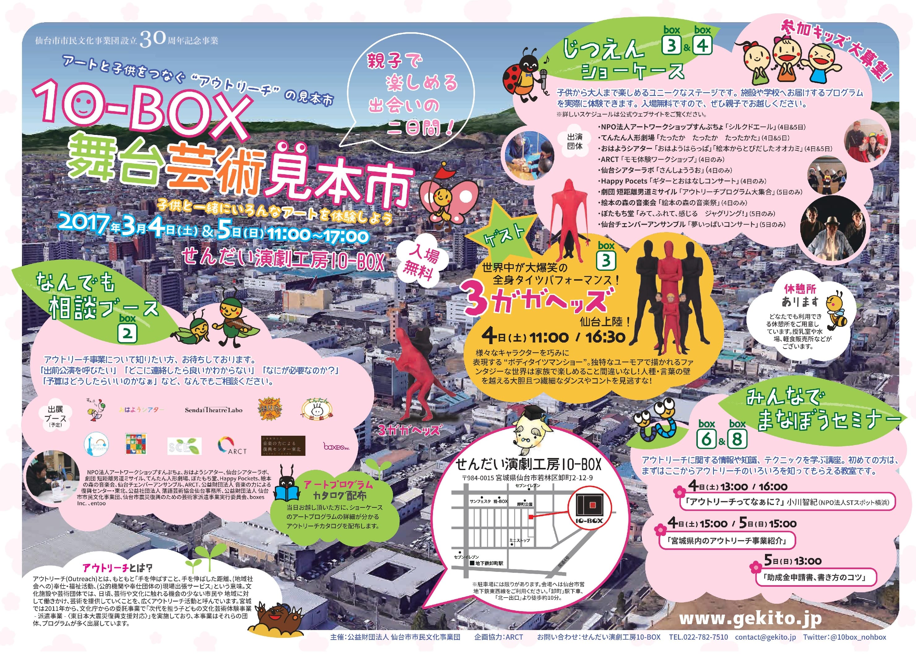 演劇の台所せんだい演劇工房10-BOXで、子供たち向けアウトリーチプログラムの見本市を開催します。アウトリーチは、アーティストが市民の生活の場に積極的に入り込むことによって、芸術に関心をもってもらおう!という活動です。宮城県内でも震災後に多くのアウトリーチ活動が実施されてきました。地元の優れたプログラムの紹介から、ゲストプログラムの披露、また施設でアウトリーチを実施するための様々な情報・テクニックを知って体験するコーナーを設けます。表現する人と。子供たちに携わる人と、企業や行政が出会う場所として、10-BOX舞台芸術見本市を開催します。