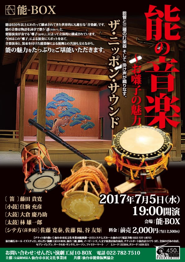 能は650年以上にわたって継承されてきた世界的にも稀有な「音楽劇」です。能の音楽は物語を詞章で歌う「謡(うたい)」と、楽器演奏が奏でる「囃子(はやし)」によって立体的に構成されています。今回はこの「囃子」による演奏にスポットをあて、音楽演奏と、装束を付けた能楽師による能舞との共演も交えながら、能の魅力をたっぷりとご堪能いただきます。