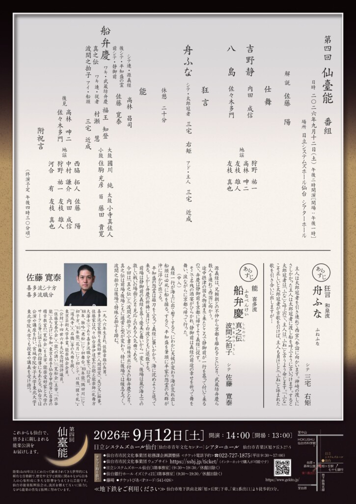 第四回仙臺能 能 喜多流「船弁慶 真之伝 波間之拍子」/ 狂言 和泉流「舟ふな」