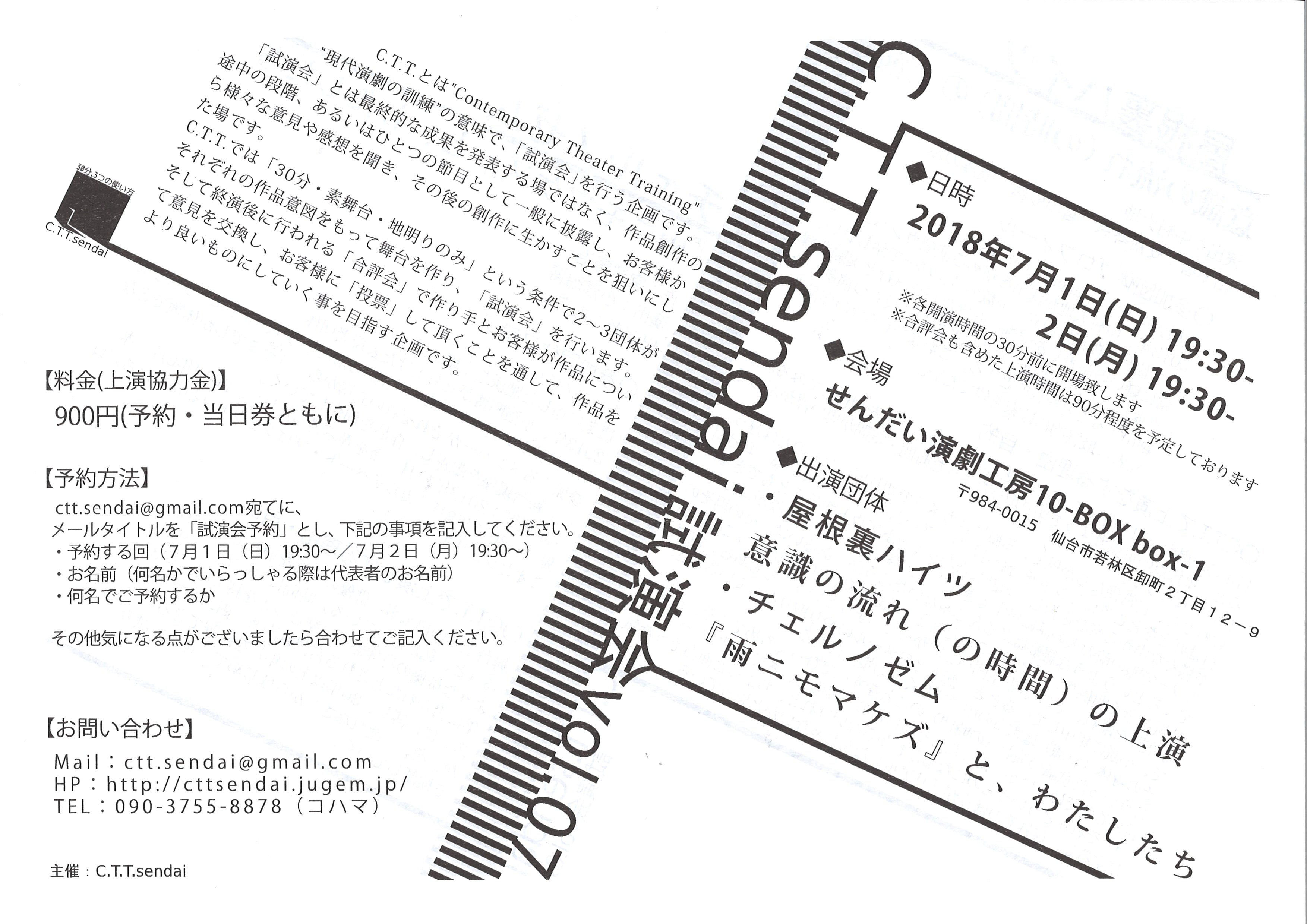 ctt.sendai@gmail.com宛てに、メールタイトルを「試演会予約」とし、下記の事項を記入してください。