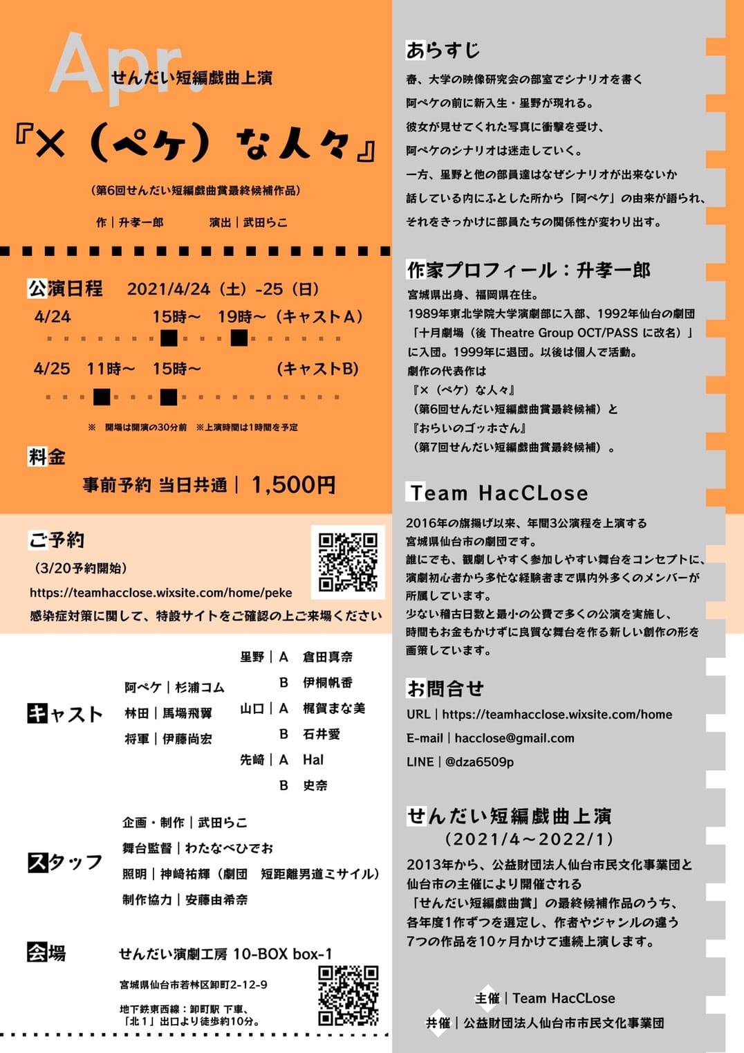 【公演延期】Team HacCLose せんだい短編戯曲賞上演 Apr. 『✕(ペケ)な人々』