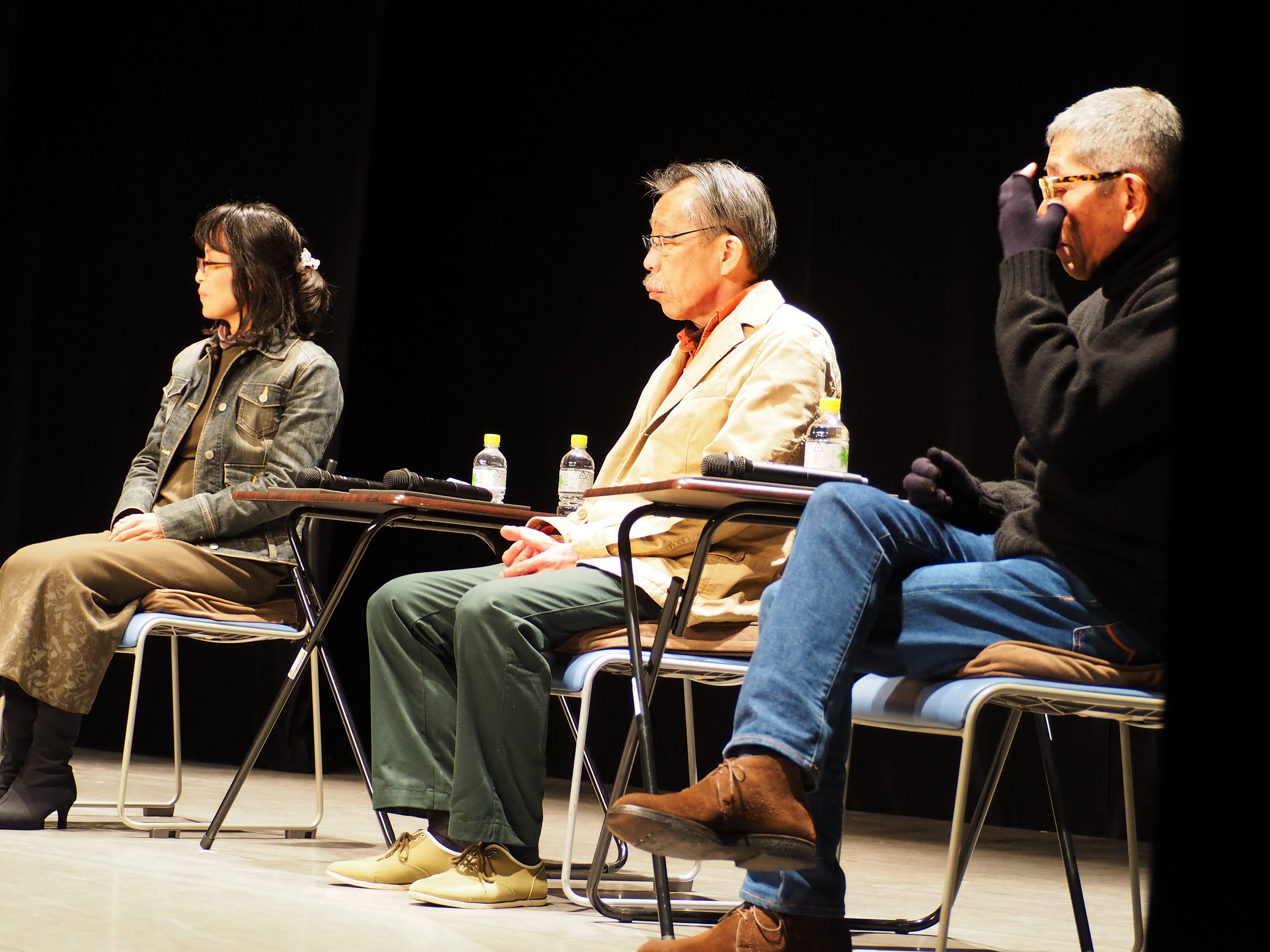 客 私は東京から参りました。若い時になかじょうさんとちょっと一緒にやっていたことがあって、知り合いだから来たというだけで、テーマに興味があって来たというわけでもないのが正直な気持ちです。なので、3作品見させていただいて、東北の人たちの震災に対する思いはやっぱり違うなって改めて思ったんですね。肌というか皮膚というか生というか、ヒリヒリした感じがすごくして、それに比べると、やっぱり東京では報道ももうほとんど無いわけで。私も「あ、まだこういうことをやってるんだ」って、不謹慎ですけれどもそう思ったりもしました。こちらの方の意識と東京の意識の違いというか、差について何か思われることはありますか?