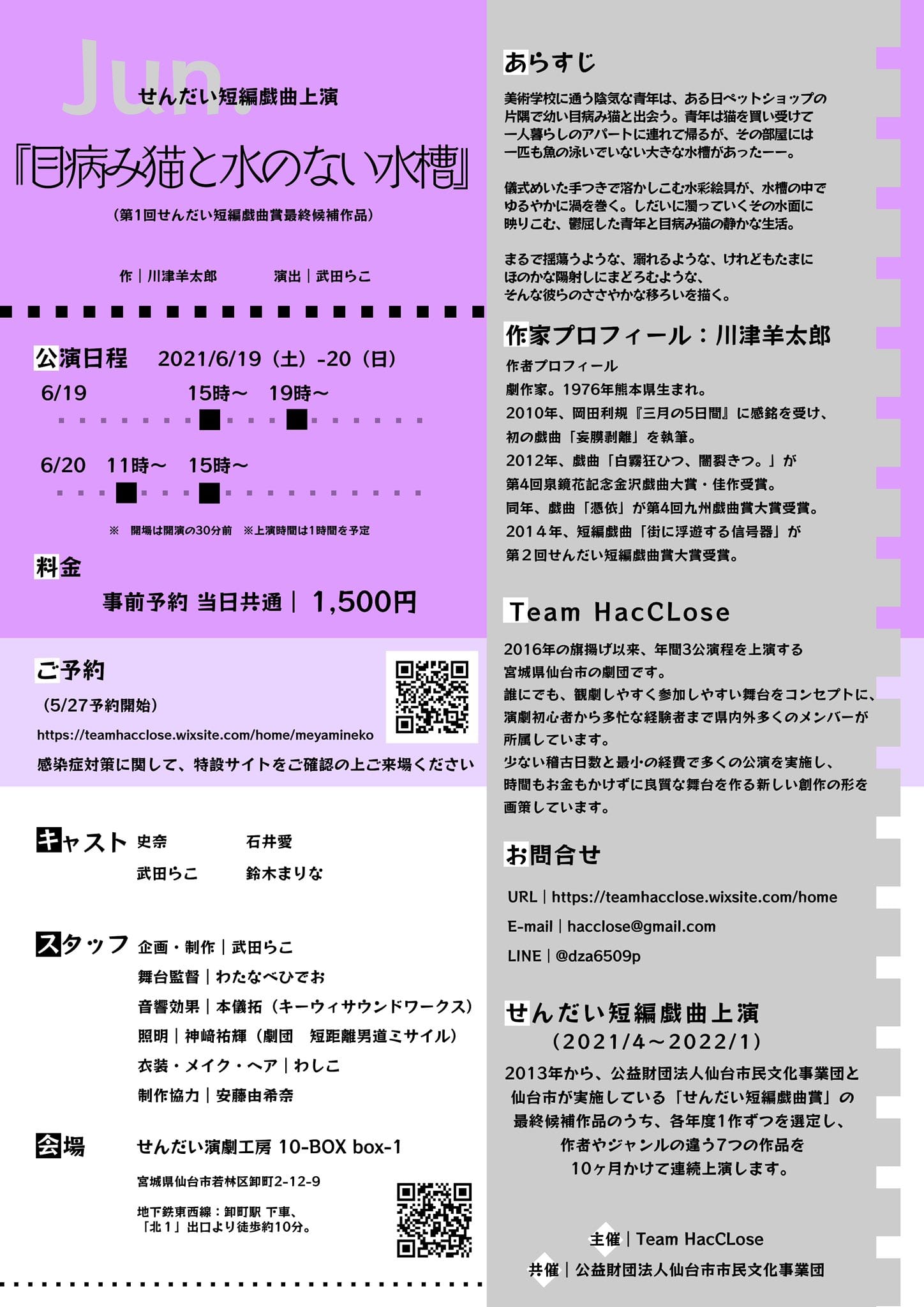 Team HacCLose せんだい短編戯曲上演 Jun. 『目病み猫と水のない水槽』