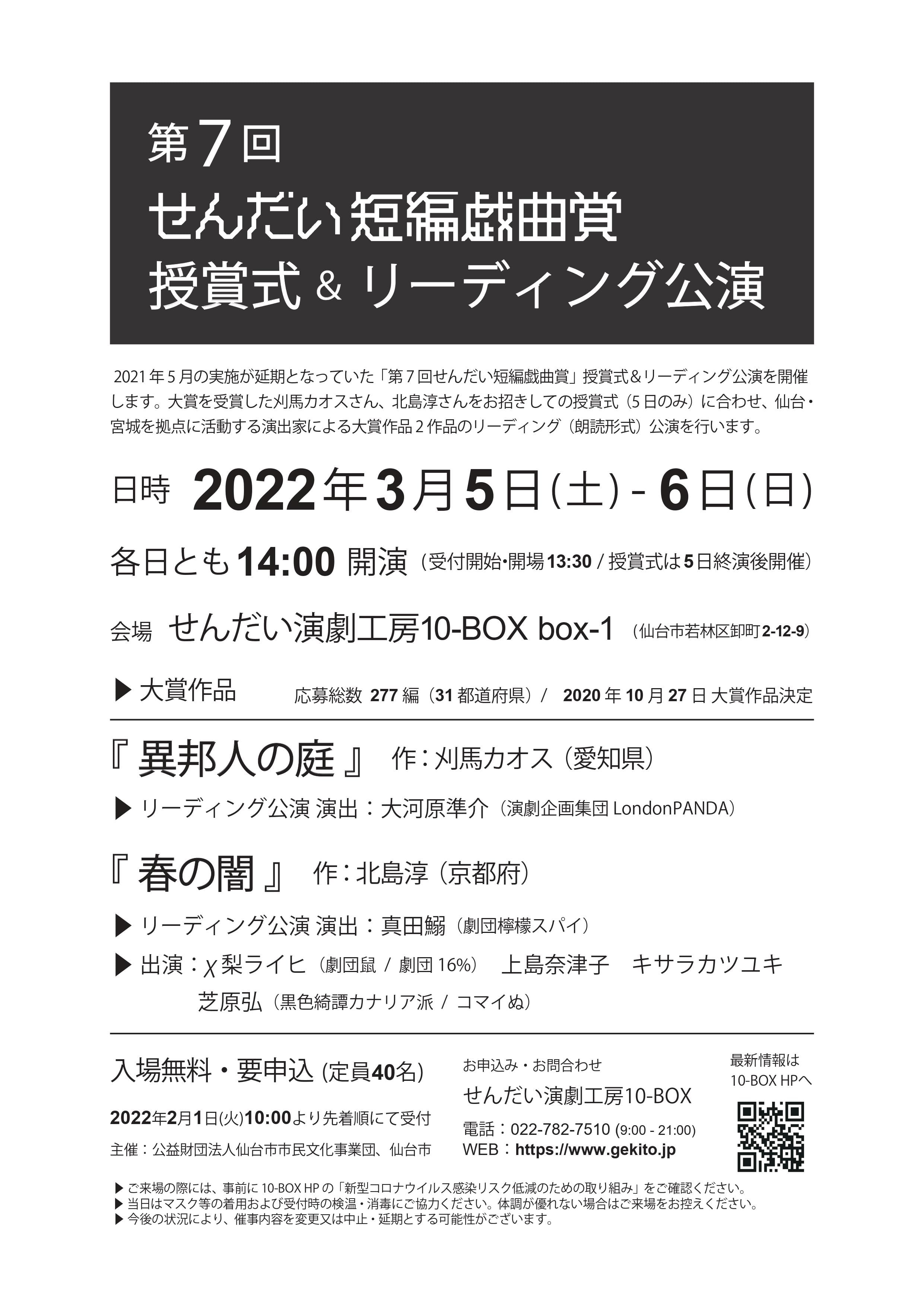 2021年5月の実施が延期となっていた「第7回せんだい短編戯曲賞」授賞式&リーディング公演を開催します。大賞を受賞した刈馬カオスさん、北島淳さんをお招きしての授賞式(5日のみ)に合わせ、仙台・宮城を拠点に活動する演出家による大賞作品2作品のリーディング(朗読形式)公演を行います。