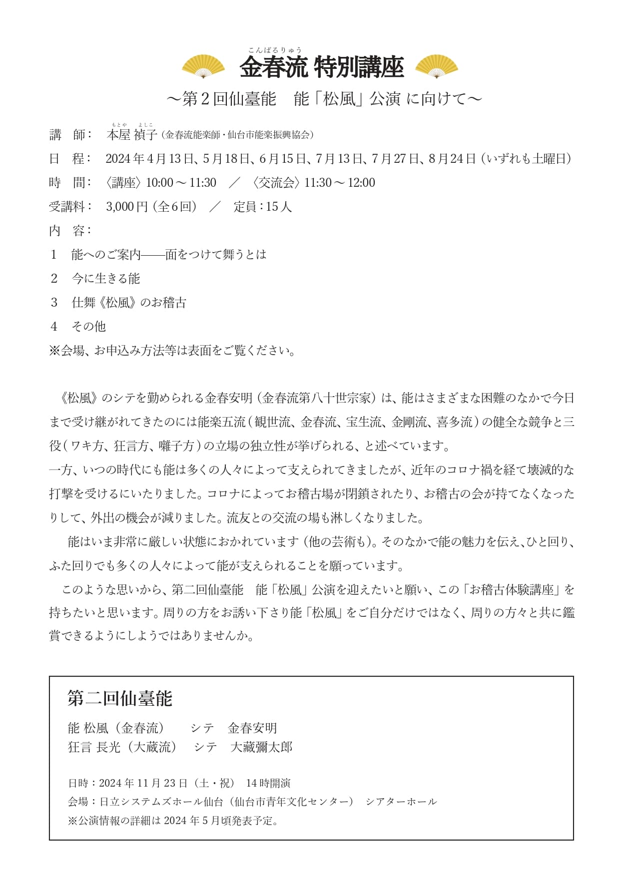 A.金春流「特別講座 ~第2回仙臺能 能「松風」公演に向けて~」