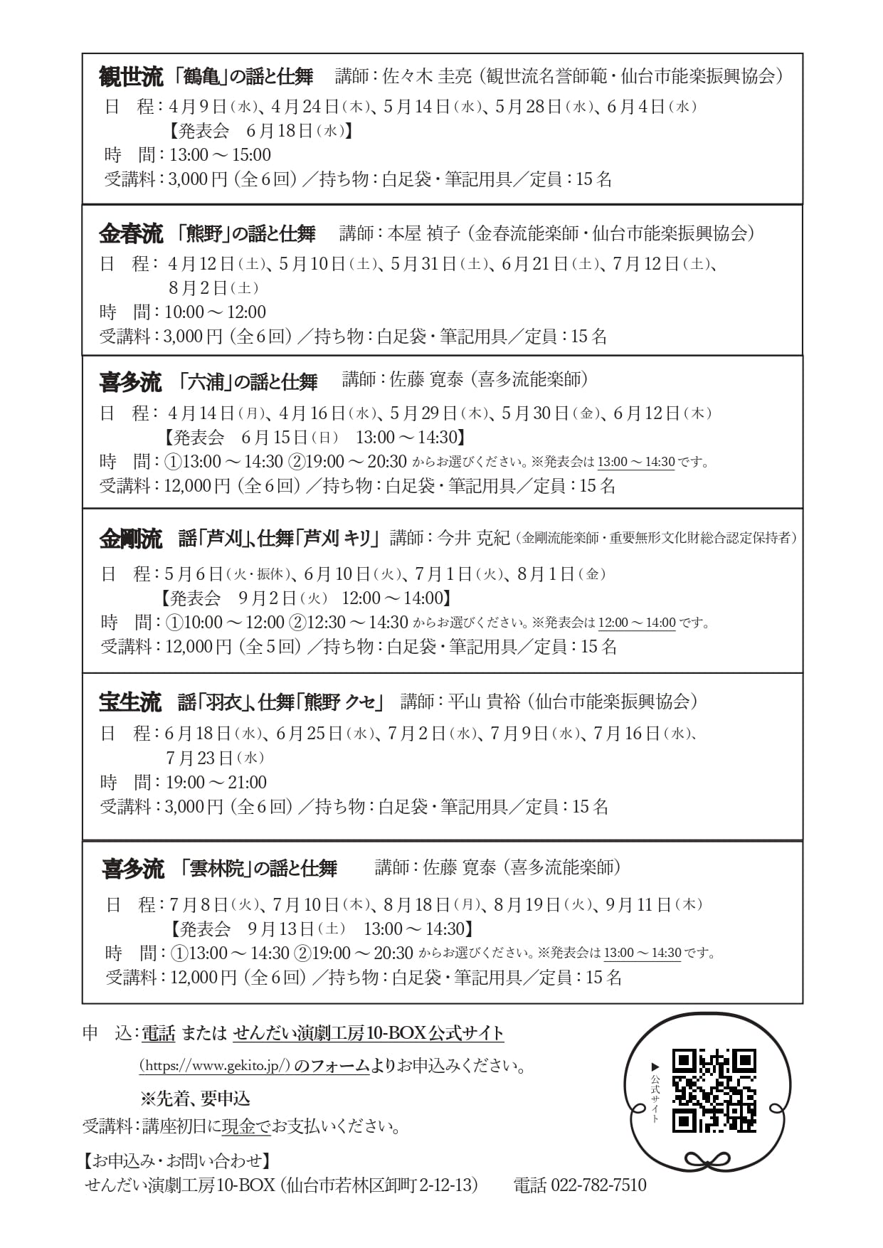 受講料:3,000円(全6回) ※扇と「鶴亀」の謡本をお持ちの方は当日ご持参ください。